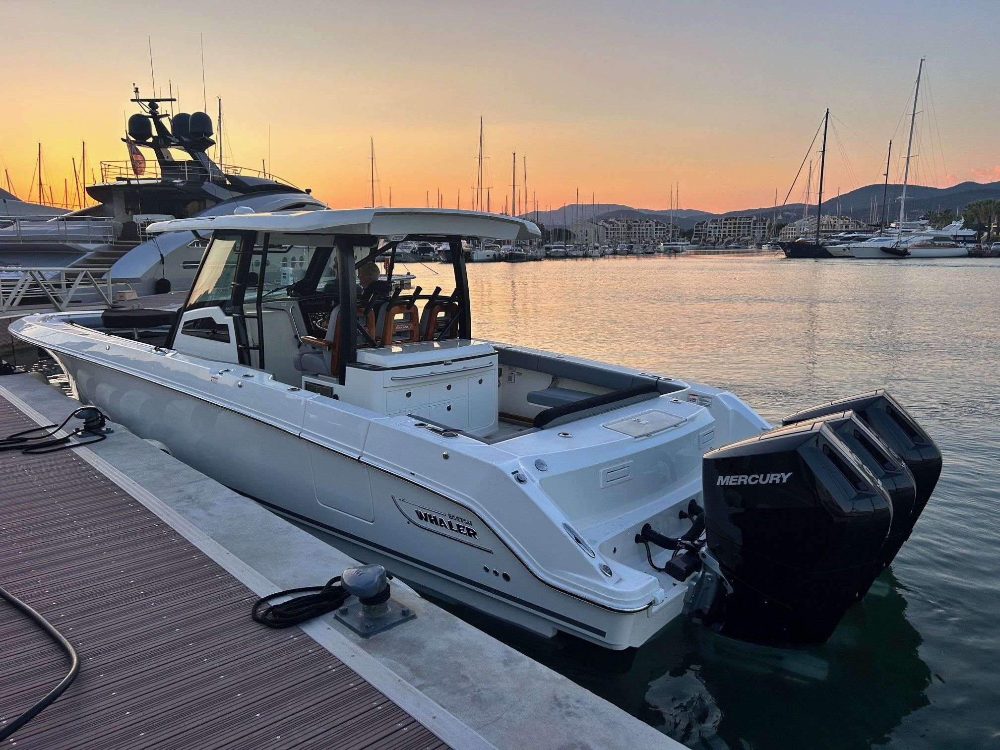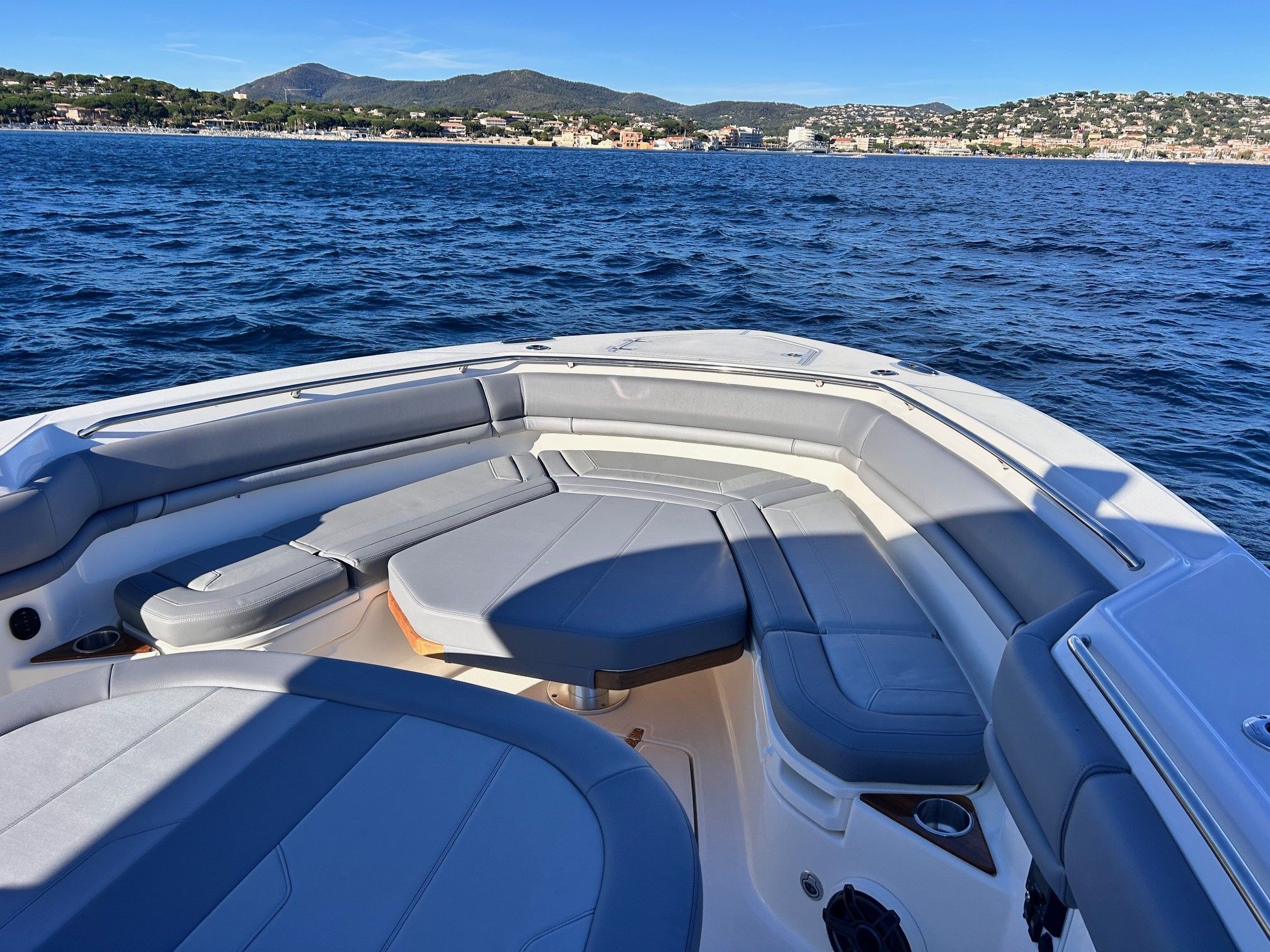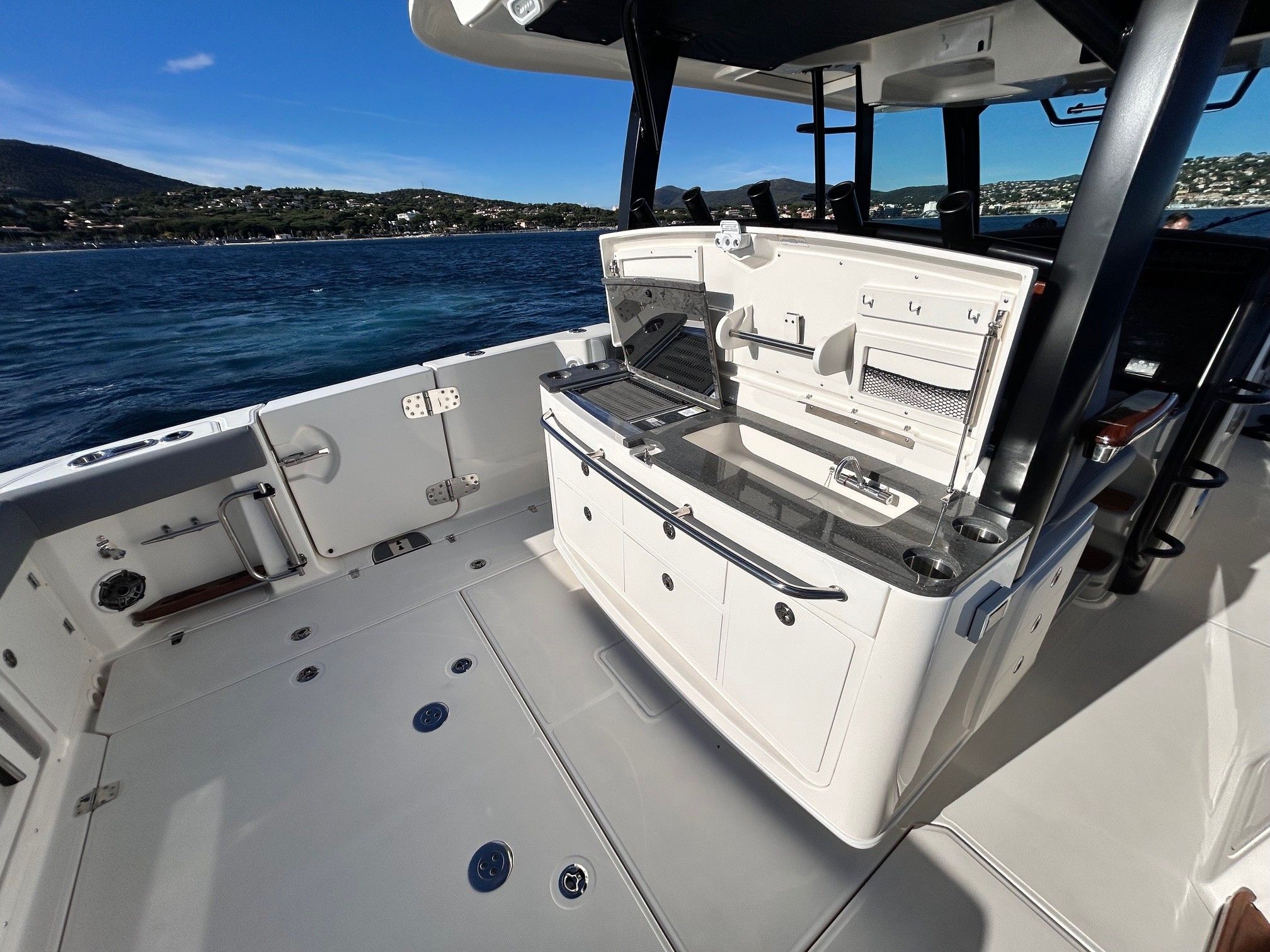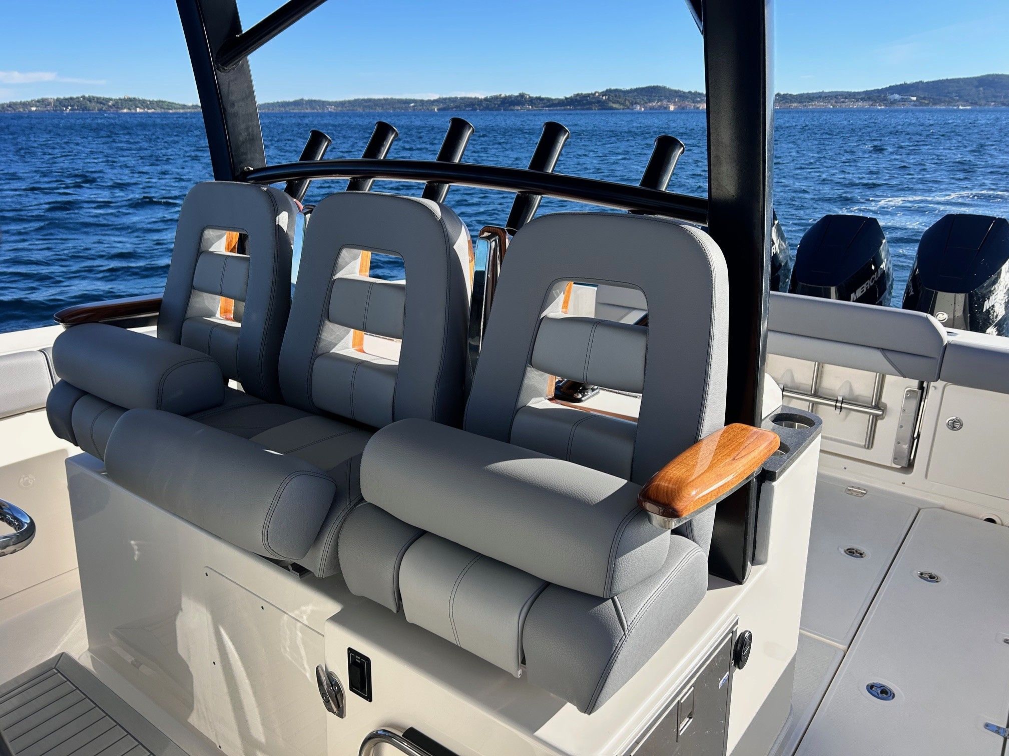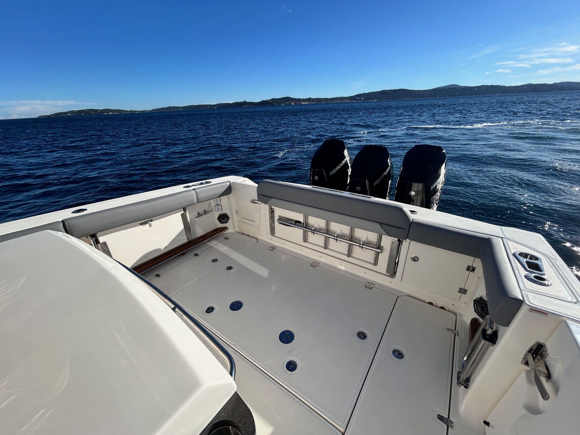Équipements principaux : Triple motorisation Mercury V10 400 ch, Joystick Piloting System (JPO), Wet bar arrière, Table avant électrique en teck, Détails en teck sur le plancher et les assises, Armature T-Top noire, Sellerie grise, Groupe électrogène, Climatisation cabine, Système audio Fusion / JL Audio, Éclairage LED d’ambiance