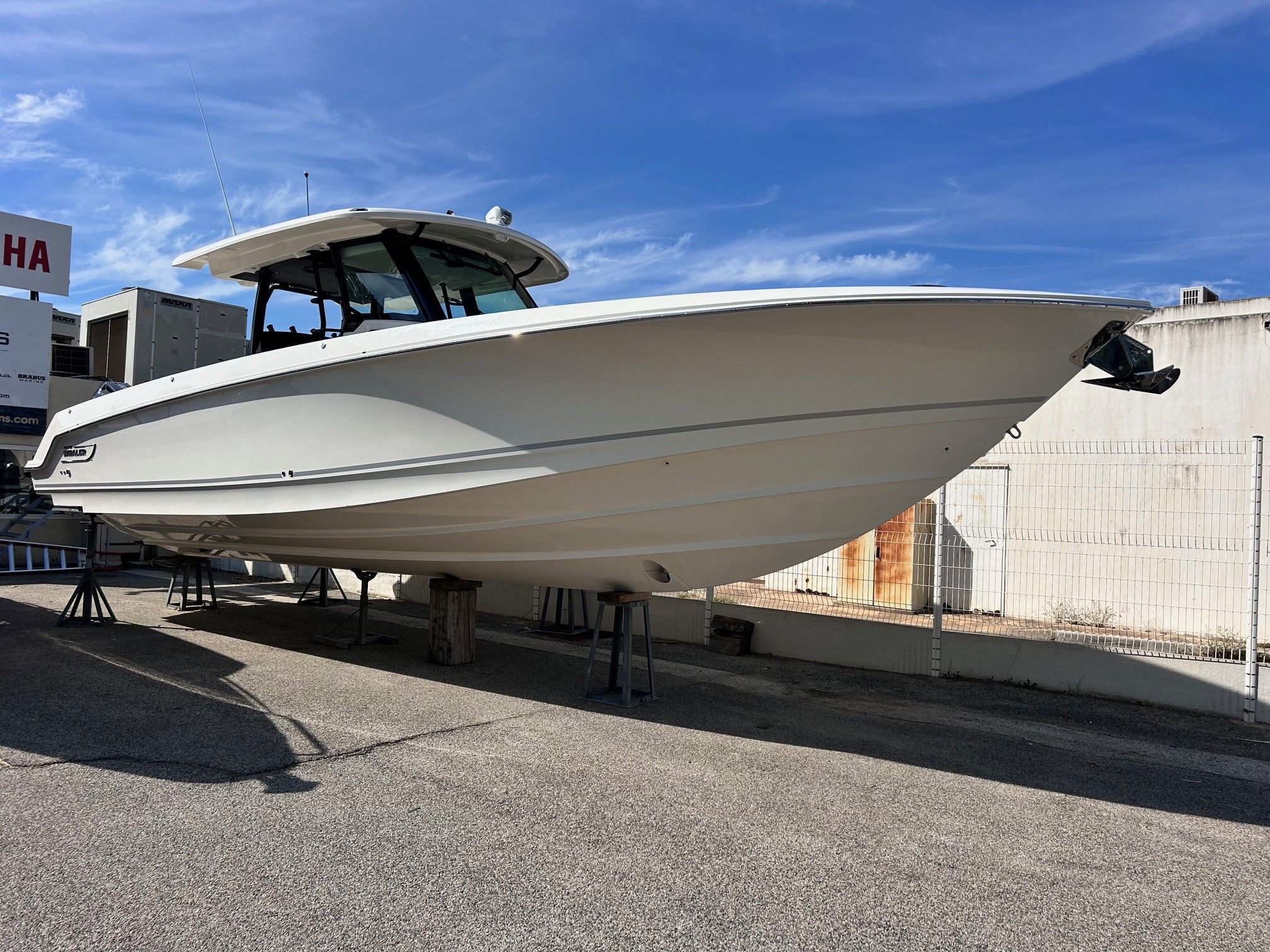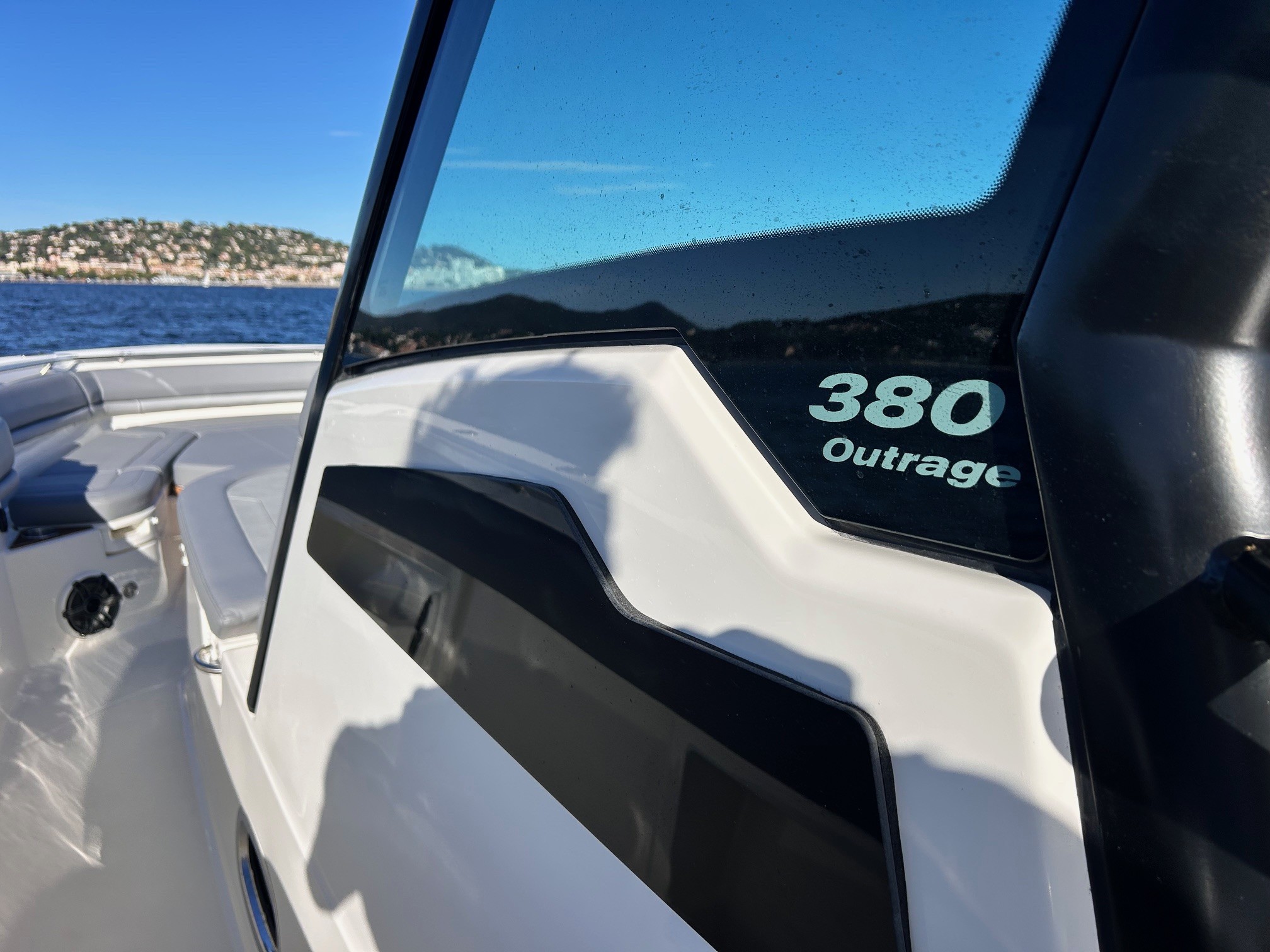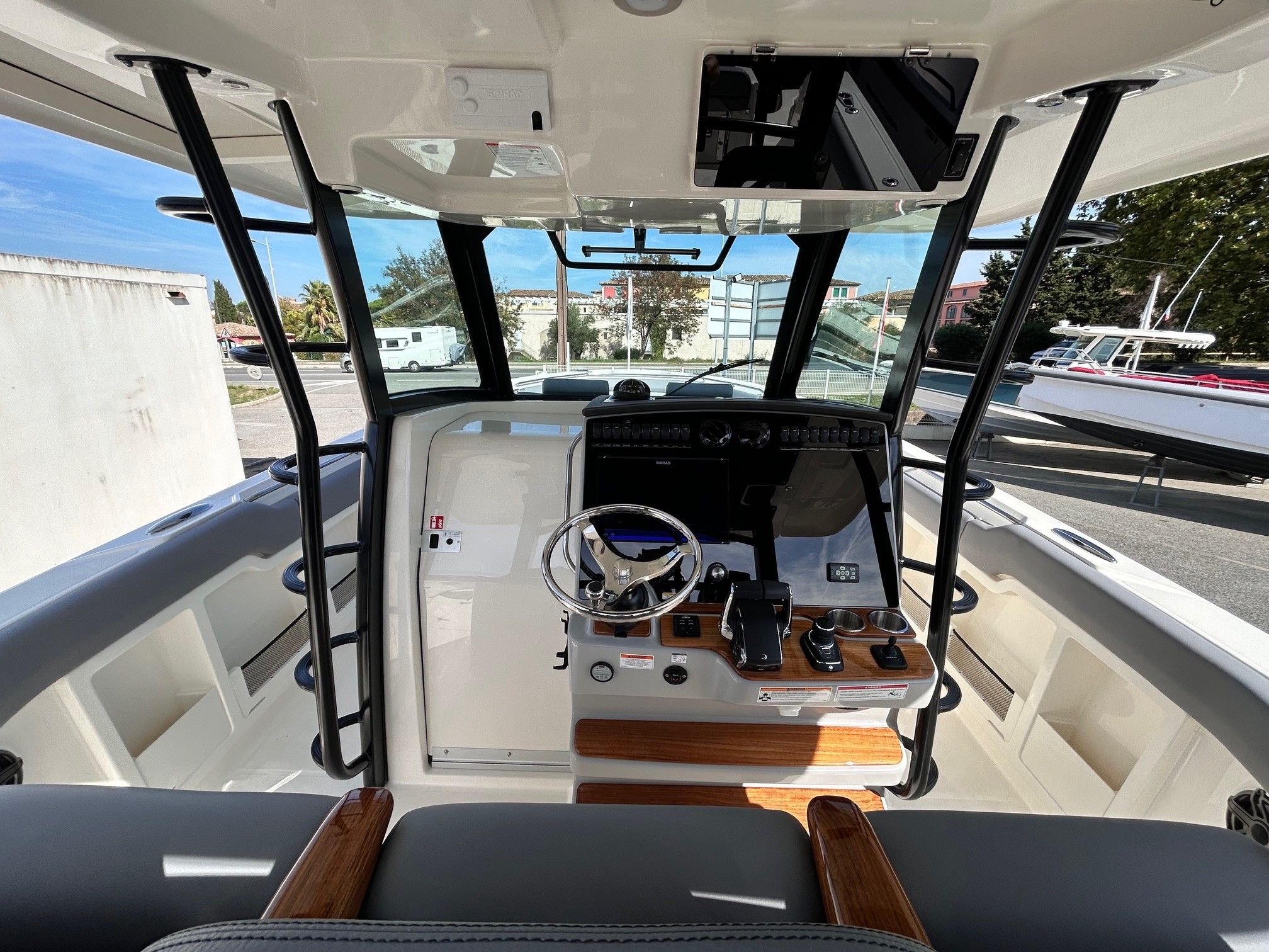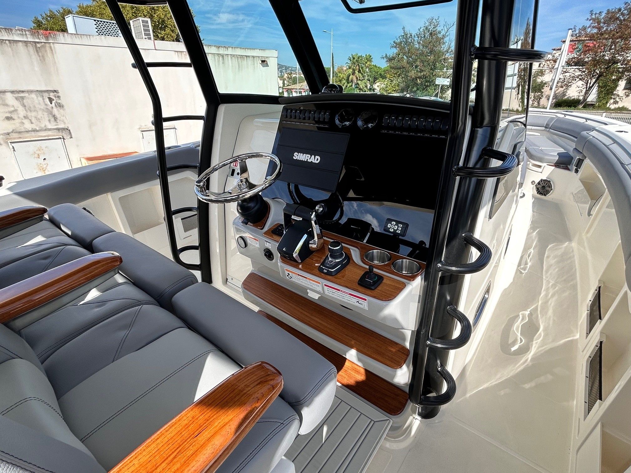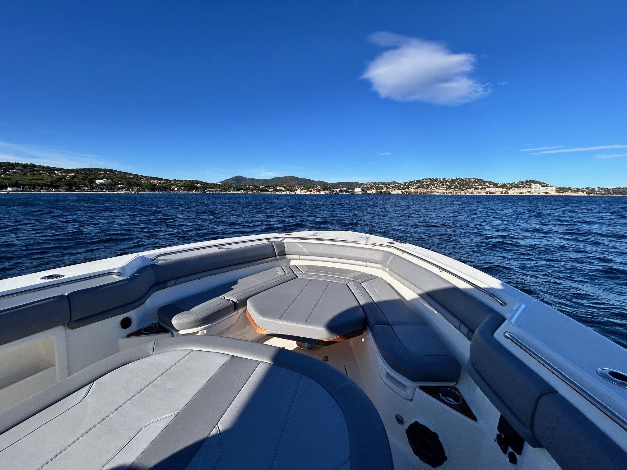 Équipements principaux : Triple motorisation Mercury V10 400 ch, Joystick Piloting System (JPO), Wet bar arrière, Table avant électrique en teck, Détails en teck sur le plancher et les assises, Armature T-Top noire, Sellerie grise, Groupe électrogène, Climatisation cabine, Système audio Fusion / JL Audio, Éclairage LED d’ambiance