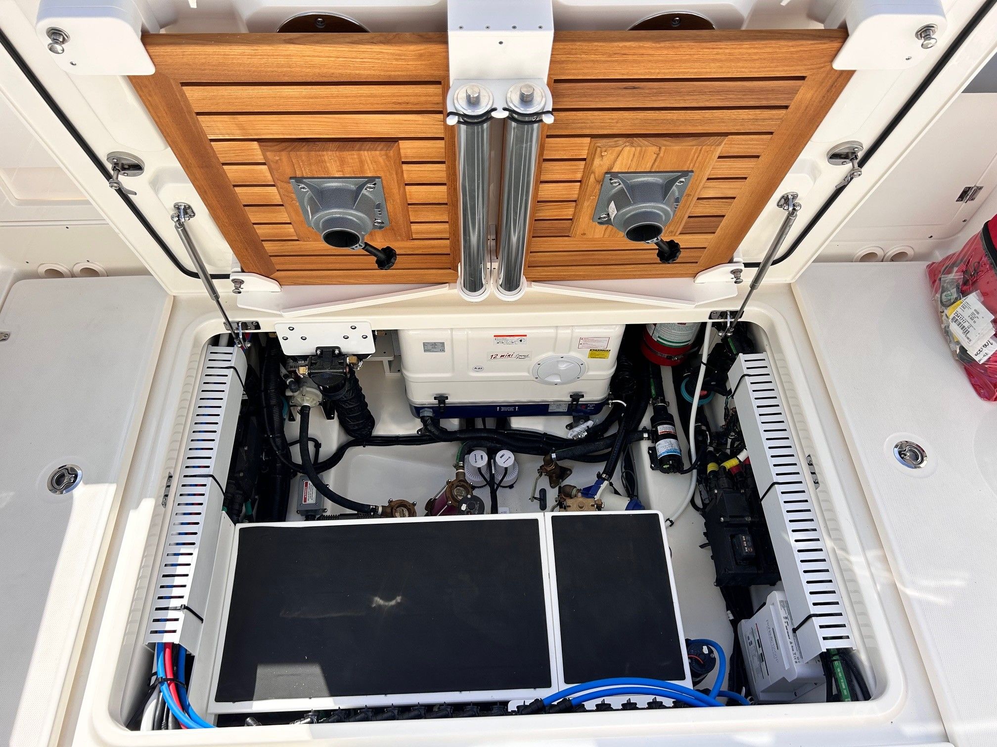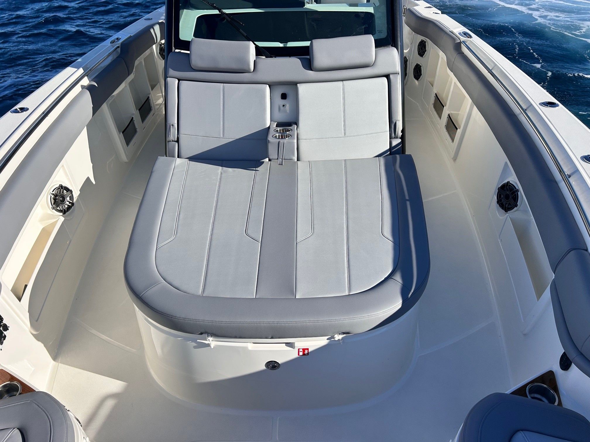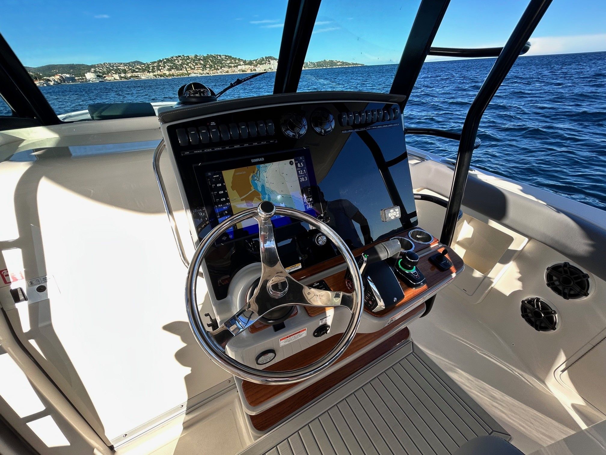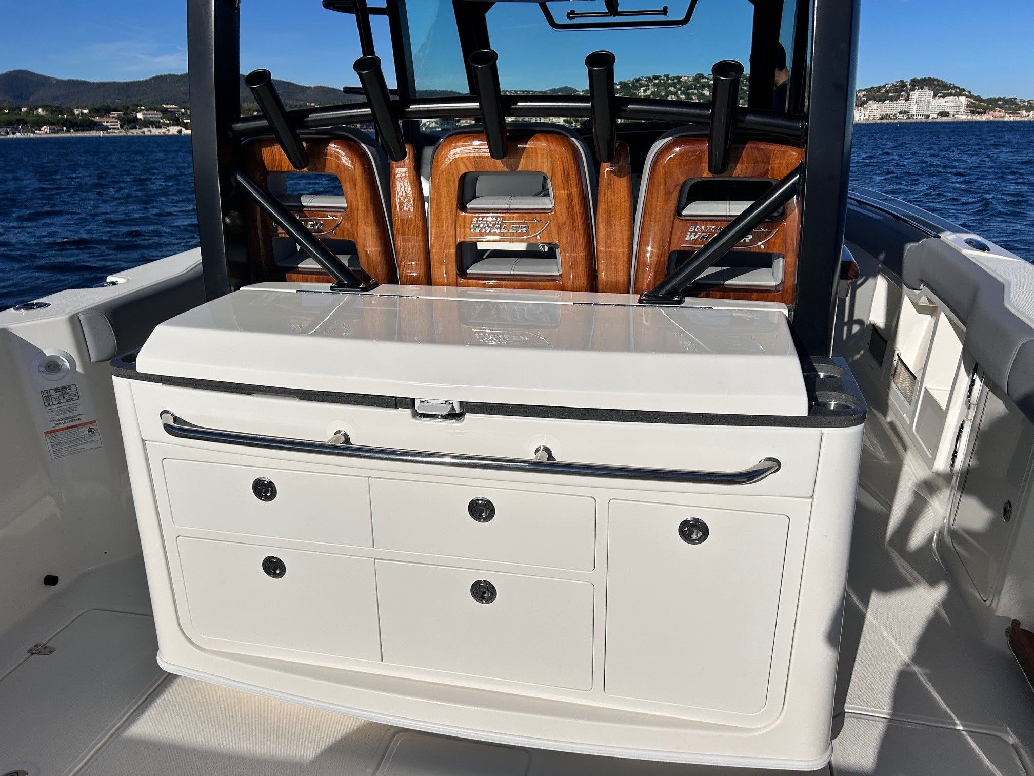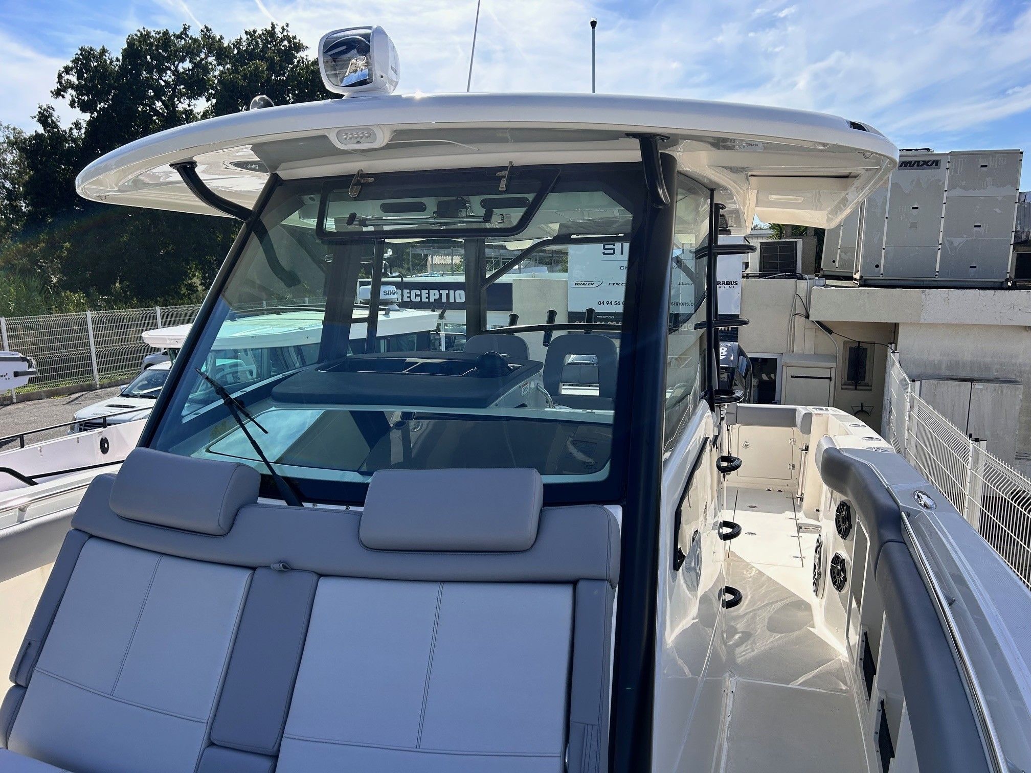 Équipements principaux : Triple motorisation Mercury V10 400 ch, Joystick Piloting System (JPO), Wet bar arrière, Table avant électrique en teck, Détails en teck sur le plancher et les assises, Armature T-Top noire, Sellerie grise, Groupe électrogène, Climatisation cabine, Système audio Fusion / JL Audio, Éclairage LED d’ambiance