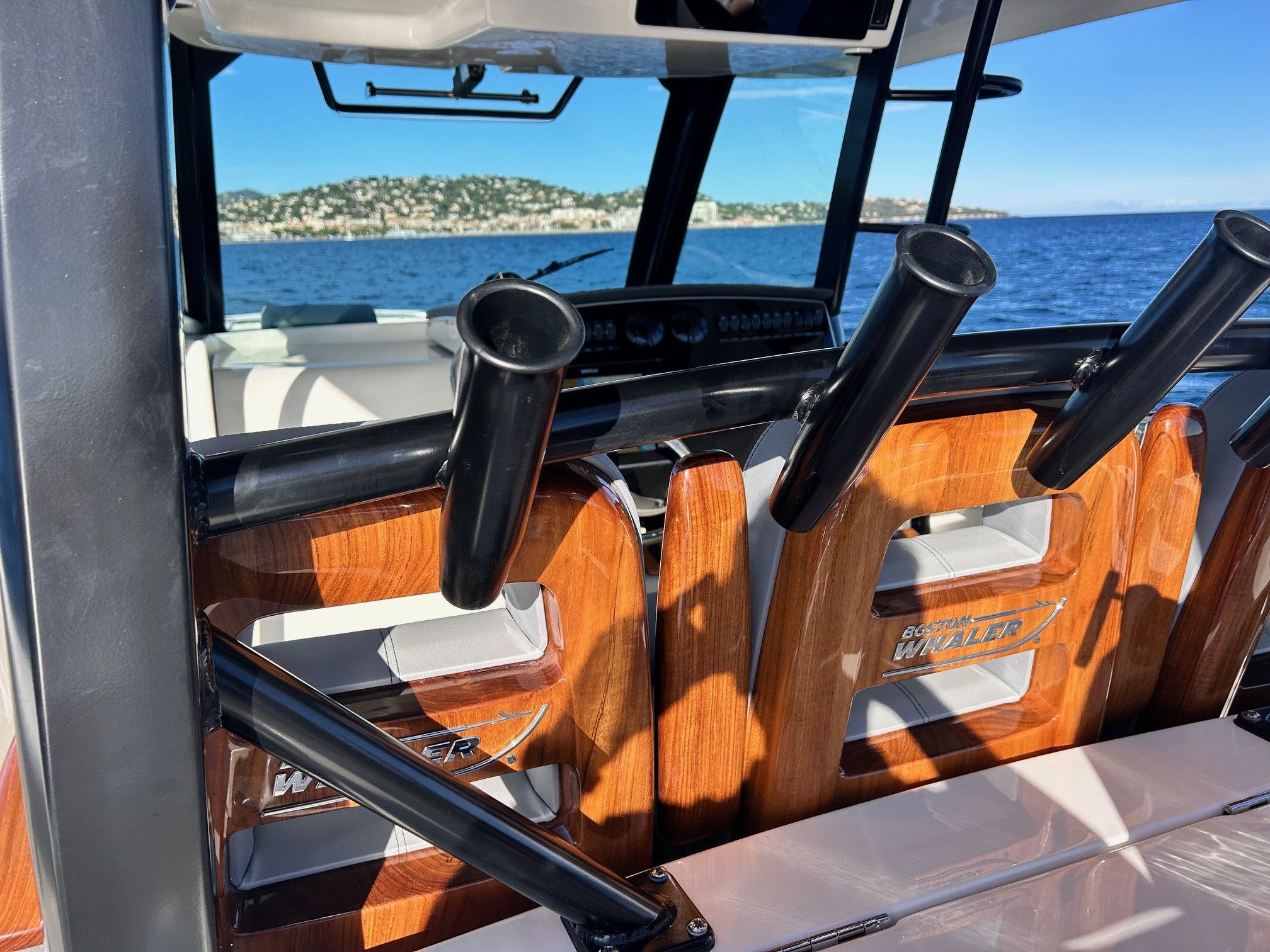 Détails en teck sur dossier de siège et console